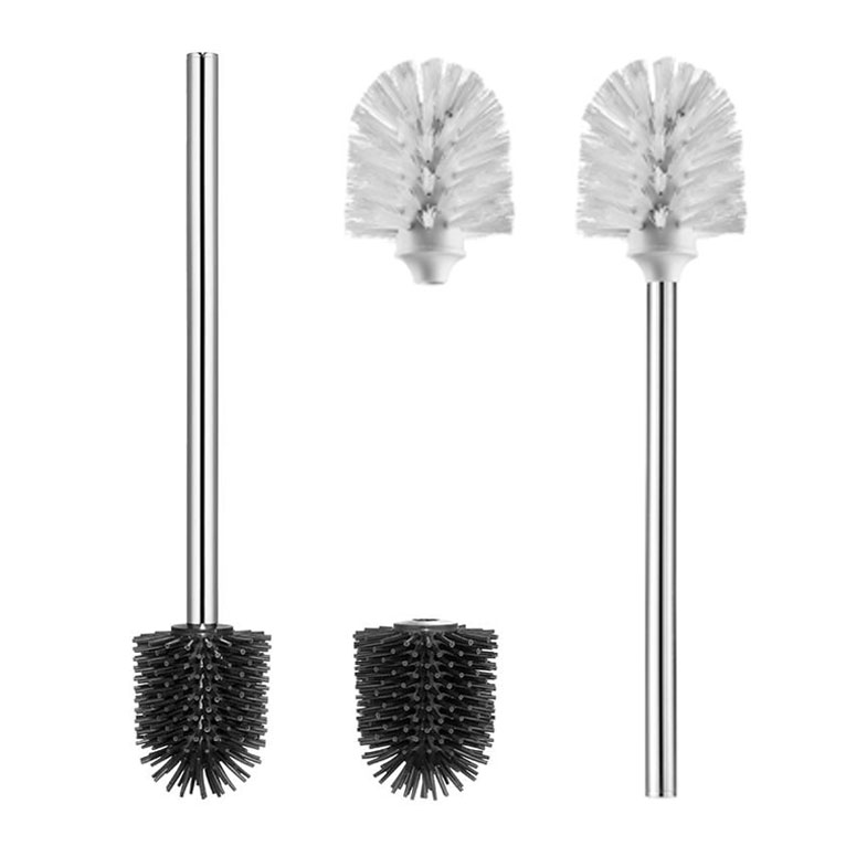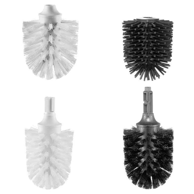 Komplette WC-Sets bestehend aus 1 Stück WC-Bürstengriff (optional in chrom, Edelstahl matt gebürstet, Edelstahl glänzend poliert) und 2 Stück WC-Bürstenköpfen (optional aus Polypropylen oder Silikon, in schwarz oder weiß, in den Abmessungen von Ø 60 bis 85 mm)